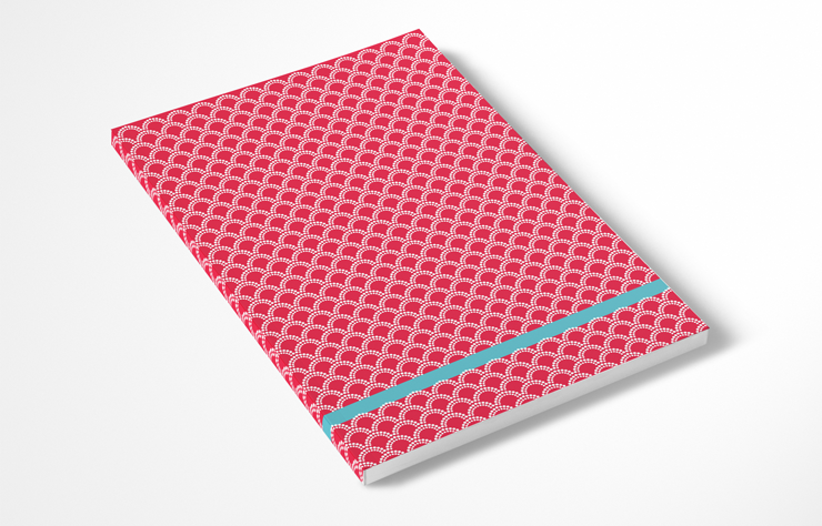 Notizbuch mit einem weissen Fächermuster auf einem pinkfarbenen Hintergrund. Frisches Design mit Stil.